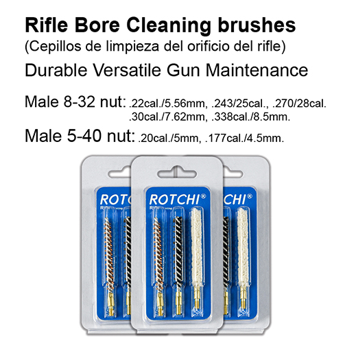 라이플 보어 청소 브러시 3-in-1 세트, 블리스터 및 카드 패키지. 사용 가능한 크기: .177, .22, .25, .27, .30, .338 cal.